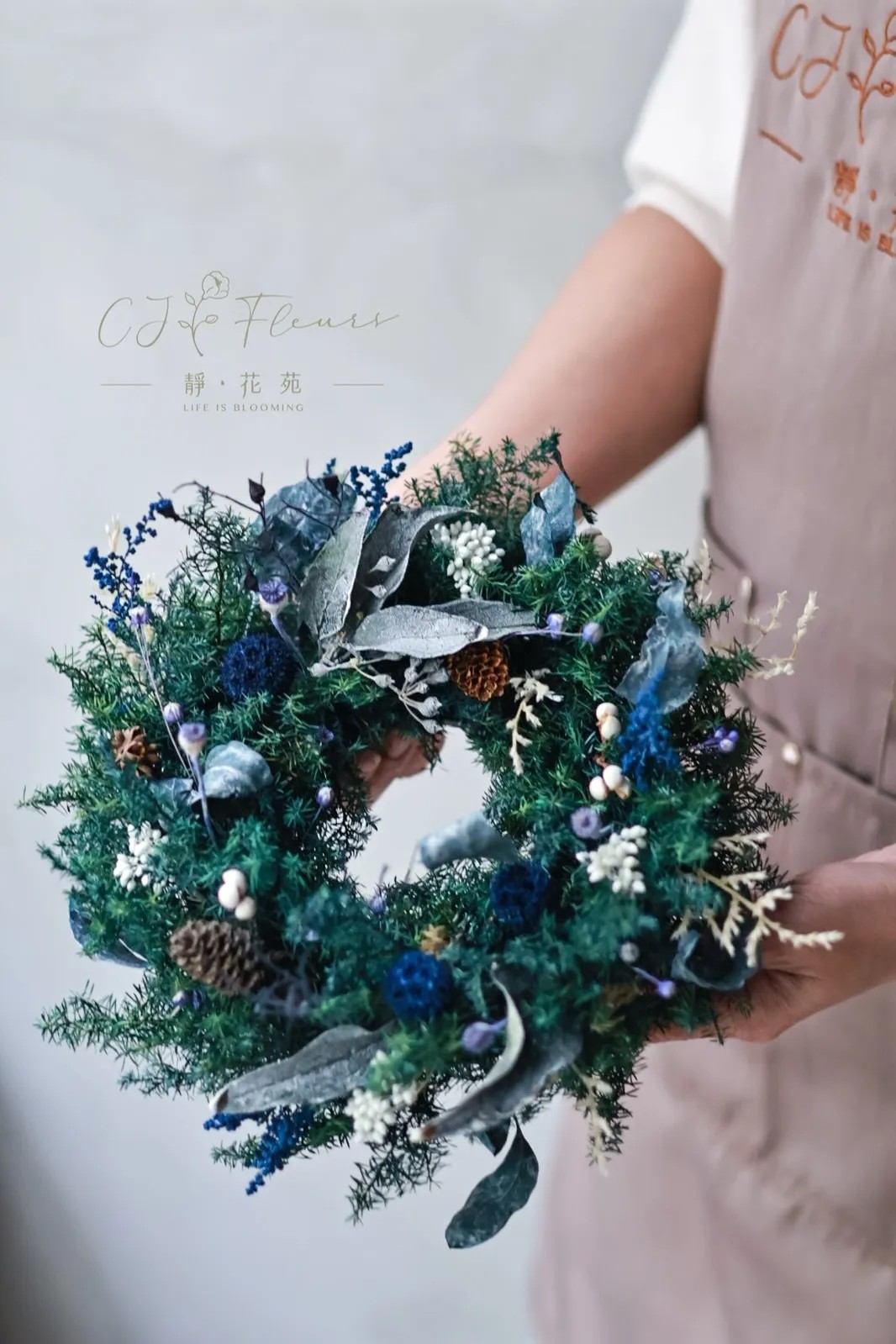 🌿 永生聖誕花圈|靜謐灰藍色調,低調卻充滿質感