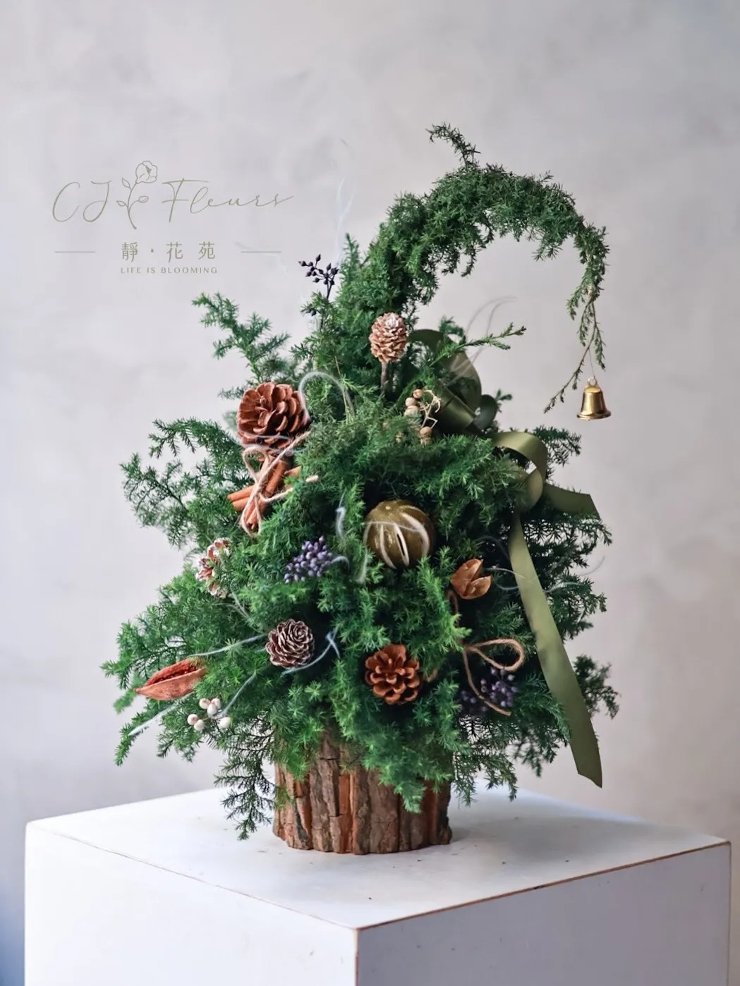 使用天然雪松或永生雪松,結合松果與乾燥果實,創作出一株獨一無二的聖誕小樹。不只是節慶的點綴,更是冬日裡的一份安靜與祝福。